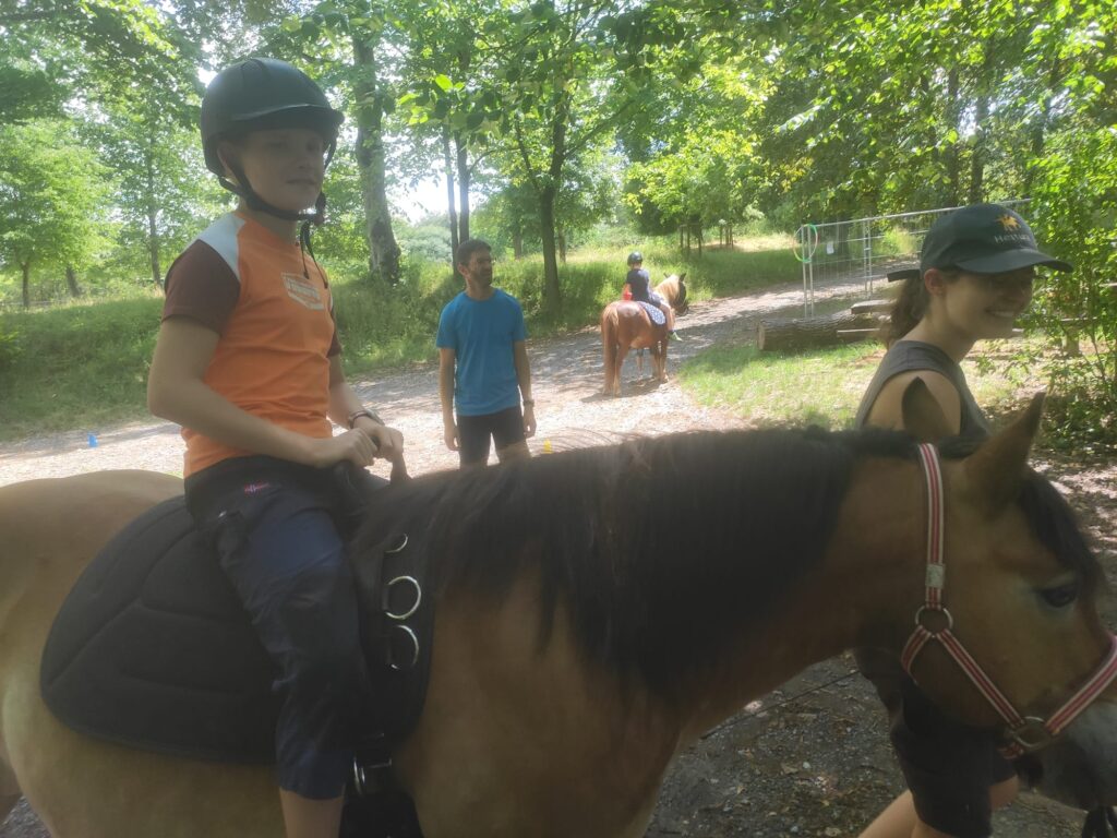 Aufgeteilt in 2 Gruppen durfte ein Teil der Kinder erstmal die Pferde richten. Sie mussten gestriegelt, gekämmt und die Hufe ausgekratzt werden. Dann wurden die Tiere gesattelt und jedes Kind durfte am Strick geführt einen kleinen Ausritt machen. Am Ende jeder Runde stand ein kleiner Parcour mit Geschicklichkeitsübungen, den alle Kinder mit Bravour und Stolz bewältigten. Da die Gruppe kleiner als geplant ausfiel, blieb noch Zeit, dass auch ein paar Erwachsene eine Runde auf einem Pferd drehen durften.